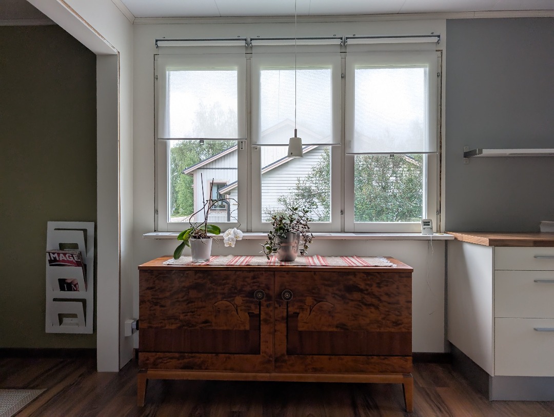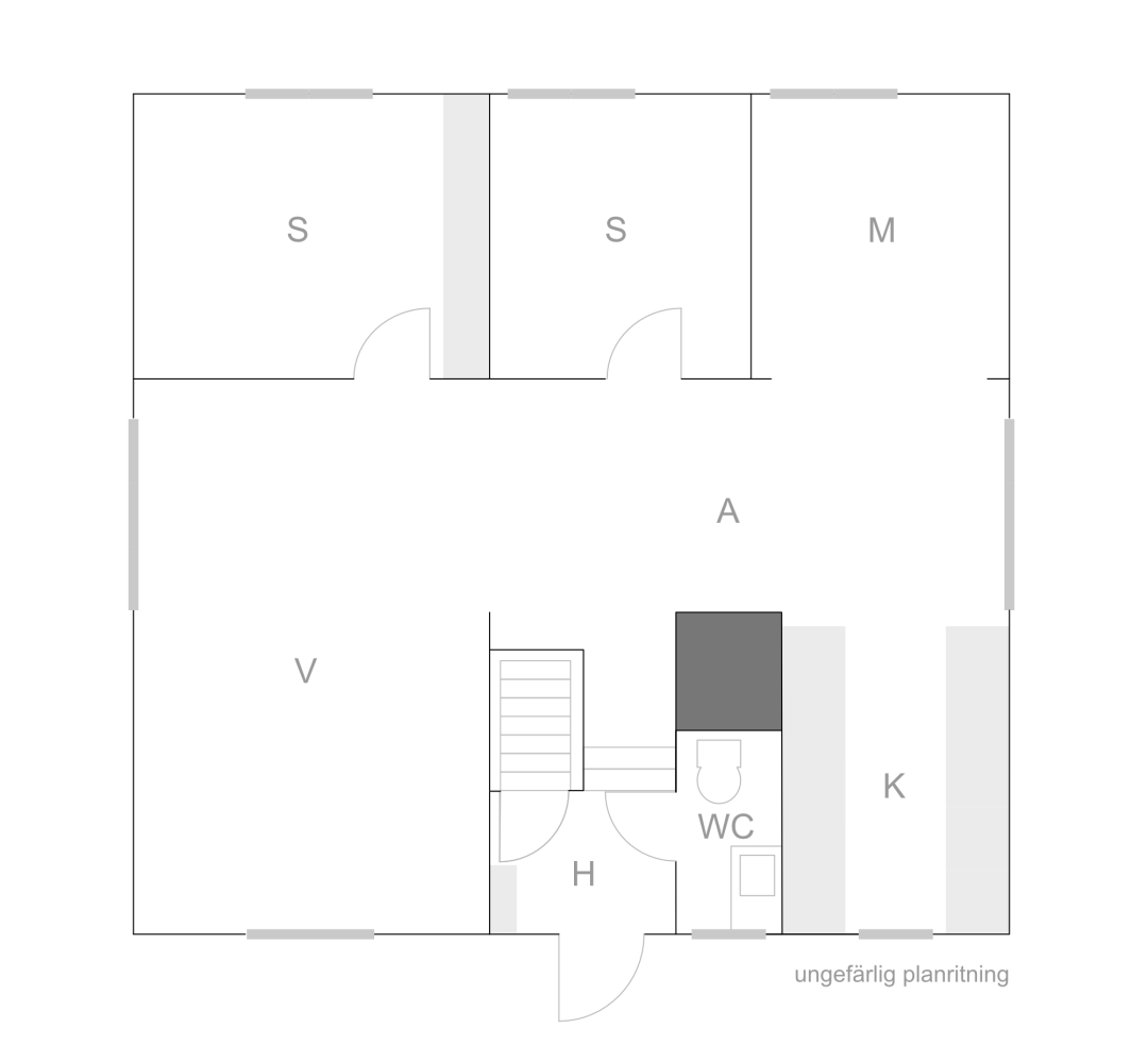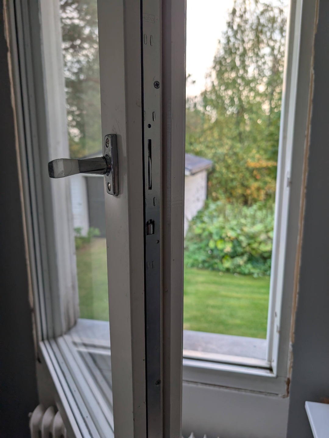 - Fönstren i bostadsvåningen byttes troligen i början av 1990-talet. Dubbelglasfönster, varav ett glas är energiglas. Fönstren öppnas inåt.