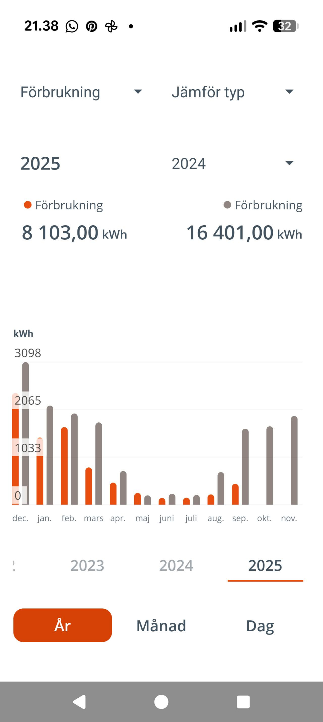 Husets elförbrukning för år 2025 fram till den 26 november är 8 103 kWh. Huset har under hösten endast haft grundvärme. Den nya Panasonic-värmepumpen är nu mer energieffektiv än den tidigare Sanyo-pumpen, vilket innebär att förbrukningen under kalla månader kommer att bli lägre.